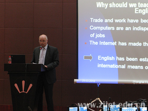 3月29日下午,上海外语教育出版社联手德国知名企业康乃馨集团 (Die Cornelsen Verlagsgruppe),在我院外国语实训基地国际会议中心举办了“2010全国高职行业英语教学研讨会”。研讨会邀请了德国职业教育著名学者Towara先生做“Success Matters – Teaching English at Vocational Colleges”的主题发言。