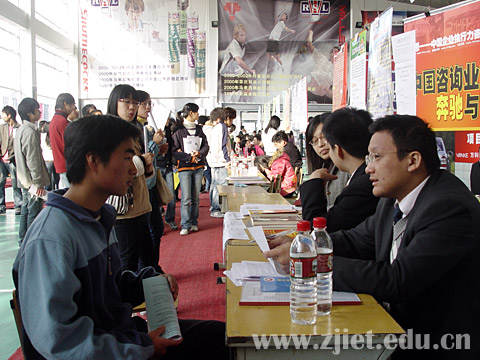 应聘学生十分珍惜这次供需见面的机会,早早来到招聘现场。各展位前人头攒动,场面十分热闹。用人单位对我院2008届毕业生的综合素质给予了良好的评价,杭州七方人力资源有限公司、浙江神力针织品有限公司、杭州富春江水电设备有限公司等诸多单位因为对前几年聘用的我院毕业生感到满意,这次又专程前来选聘的。同时,用人单位也对我院毕业生在专业技能、人文素养等方面提出了中肯的意见和建议。