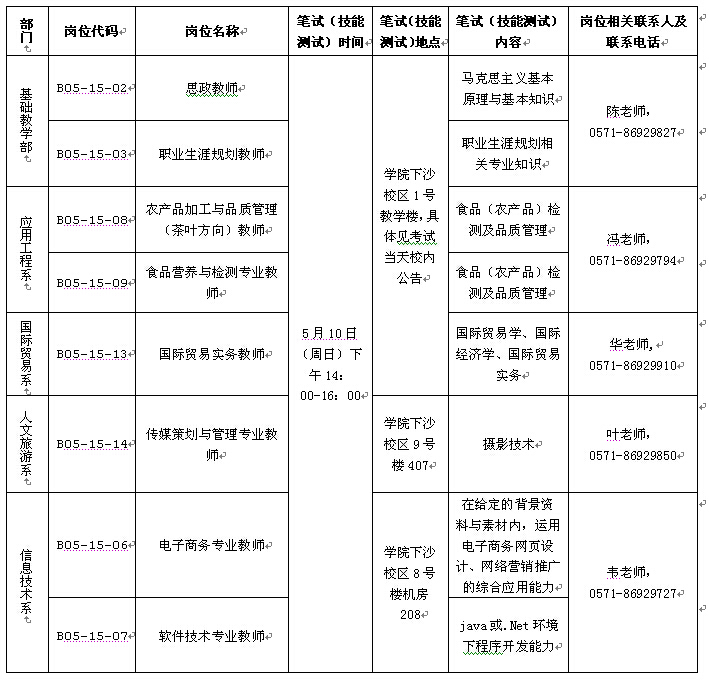 基础教学部思政教师(B05-15-02)和职业生涯规划教师(B05-15-03)、 应用工程系农产品加工与品质管理(茶叶方向)教师(B05-15-08)和食品营养与检测专业教师(B05-15-09)岗位、国际贸易实务教师(B05-15-13)岗位因通过资格审查人数较多,按照公告要求,须先行进行笔试,笔试前5名进入试讲环节,笔试、试讲和面试分别则按30%、40%、30%计入总成绩。