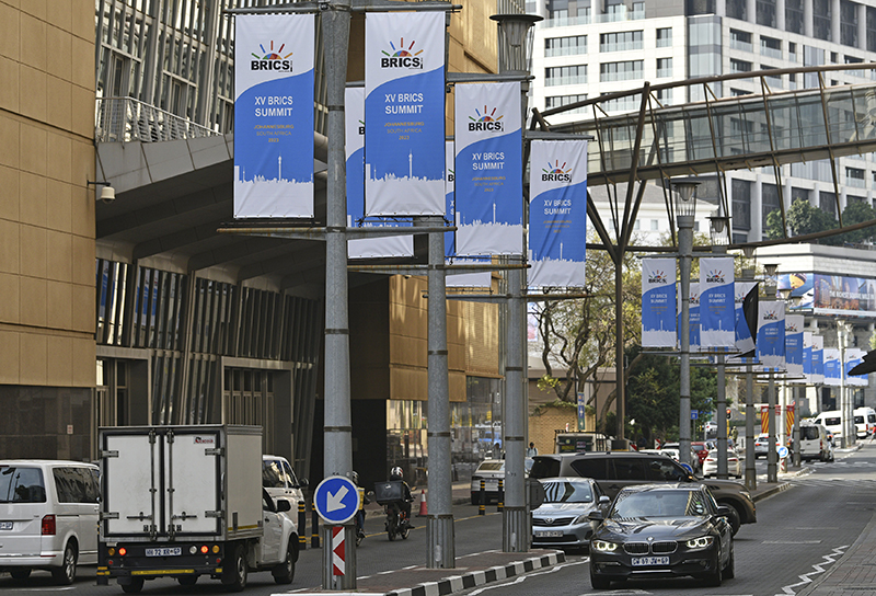 这是8月17日在南非约翰内斯堡拍摄的金砖峰会条幅。金砖国家领导人第十五次会晤将于南非约翰内斯堡举行。新华社记者 陈诚 摄